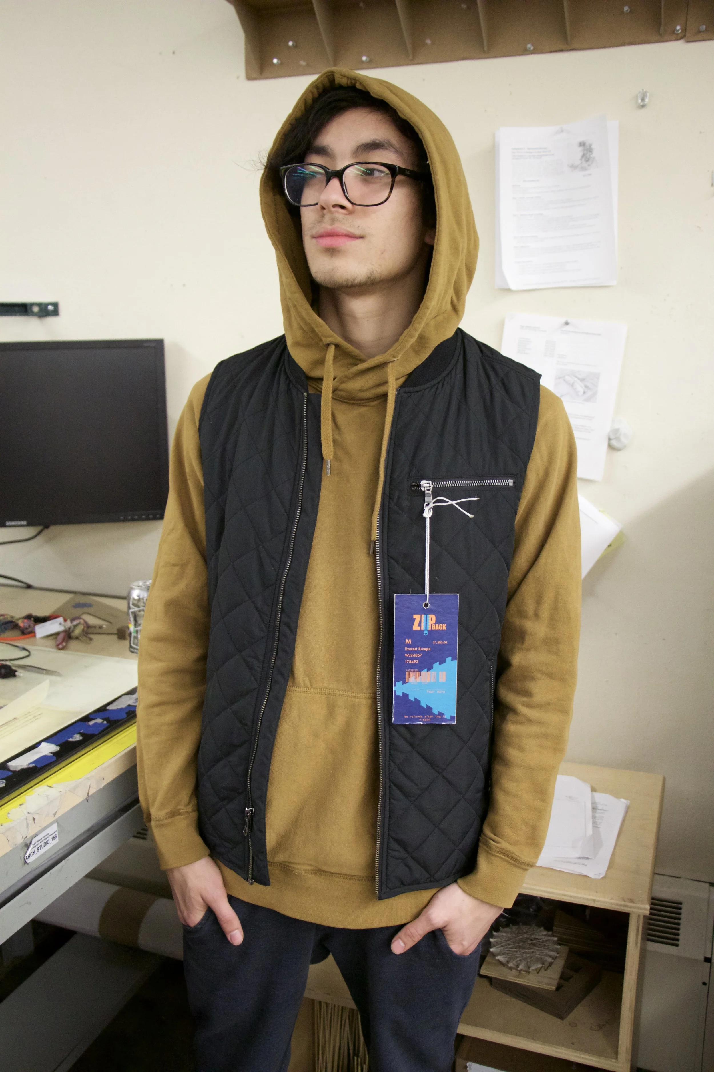 A classmate wears the final swing tag prototype